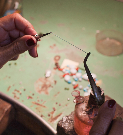細いガラス棒の小片を、デザイン画に忠実に、ジュエリーのベースに差し込んでいきます。