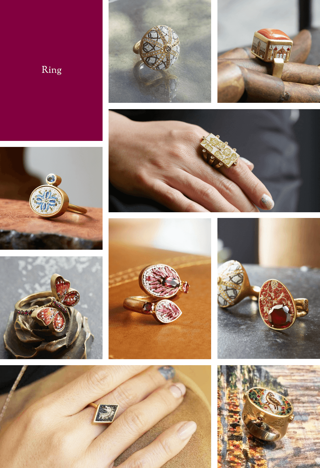 小さなピースが、作品によっては宝石とともにきっちりと埋め込まれ、あらゆる風景や自然、パターンを表現しています。